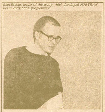 இடப்பக்க புகைப்படம் [ 9 ] : தலைப்பின்படி : ஜான் பேகஸ், ஆரம்பகால SSEC புரோகிராமர். FORTRAN (195-57)-ஐ உருவாக்கிய குழுவின் தலைவர். இரண்டாம் உலகப் போரில் அமெரிக்க ராணுவத்தில் பணியாற்றிய பிறகு , பேகஸ் 1949ல் கொலம்பியாவின் பொதுக் கல்வியியல் கல்லூரியில் கணிதத்தில் தனது இளங்கலை பட்டத்தைப் பெற்றார் ( வருடம் தெரியவில்லையாயினும், அவர் முதுகலை பட்டத்தினையும் பெற்றிருப்பார் என்று நம்புகிறேன்). 1950 லிருந்து 1952 வரை கொலம்பியா பல்கலைக்கழகத்தின் ஐ.பி.எம்.வாட்சன் ஆய்வகத்தில் ( Watson Lab ) பணியாற்றிய அவர் அதன்பின் ஐ.பி.எம் –ன் புரோகிராமிங் ஆய்வுக் குழுவினை முன்னெடுத்துச் சென்றார். 1963-ல் அவர் ஐ.பி.எம் குழுவின் உறுப்பினராக கௌரவிக்கப்பட்டார். FORTRAN தவிர, அவர் BNF (Backus Normal Form அல்லது Backus Naur Form - Noam chomsky கணினி மொழிகளுக்கான பொது இலக்கணம் கூறும் ஒரு செயலி) என்ற கணினி மொழிகளை விவரிக்கப் பயன்படும் ஒரு பொது கணினி மொழியினை உருவாக்கினார். Algol 60 என்ற திருத்தப்பட்ட அறிக்கையின் முதன்மை ஆசிரியராக இருந்த அவர் 1991-ல் பணி ஓய்வு பெற்றார். ஏ.சி.எம். டுரிங் விருதுச் சான்றில் (ACM Turing award)..,